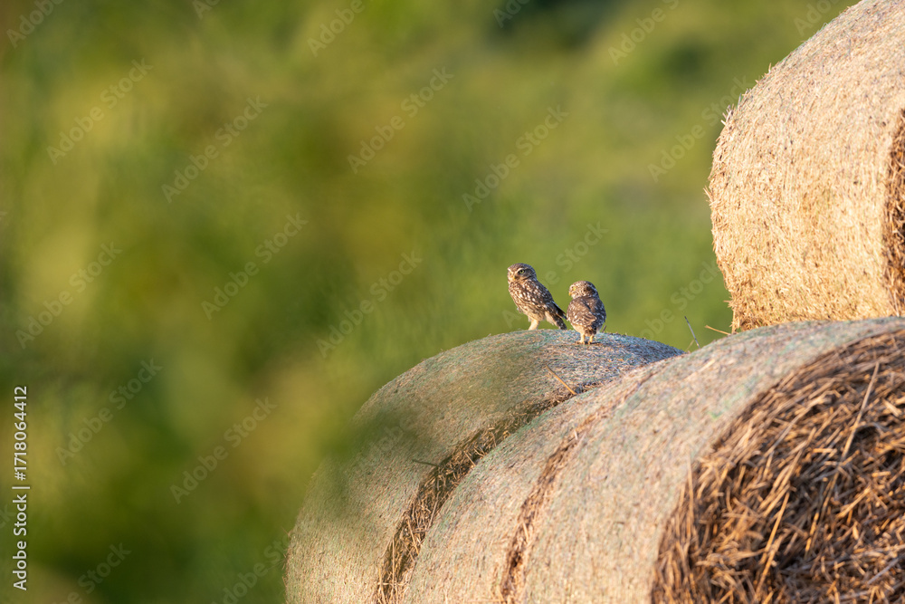 Zwei Steinkäuze (Athene noctua) auf Heuballen in weiter Sommerlandschaft, poetische Wildlife-Aufnahme im warmen Abendlicht, Symbol für Ruhe, Harmonie und ländliche Naturidylle