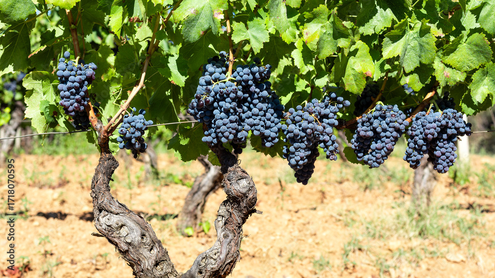 Cannonau grapes. Bunches of ripe black grapes hanging from the branches of plants in a vineyard. Traditional agriculture in Sardinia. Viticulture.