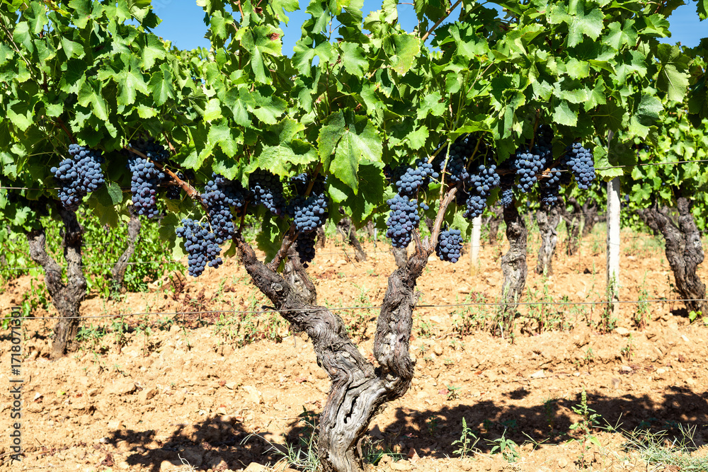 Cannonau grapes. Bunches of ripe black grapes hanging from the branches of plants in a vineyard. Traditional agriculture in Sardinia. Viticulture.