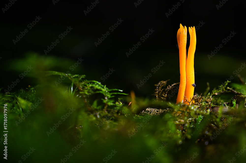 Orange mushroom on the forest floor in autumn near mossy wood, known as orange goat's beard or sticky horn of plenty (Calocera viscosa), carotenoid content, coral-like, sticky, gelatinous tear fungi.