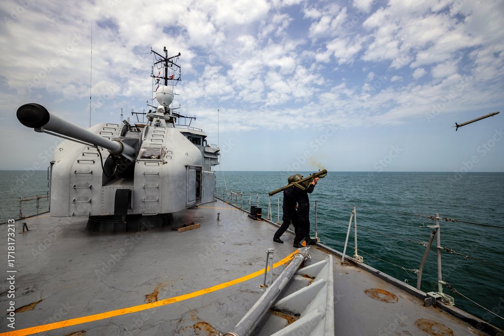 Marines fire a rocket at enemy forces during a peacekeeping mission at sea
