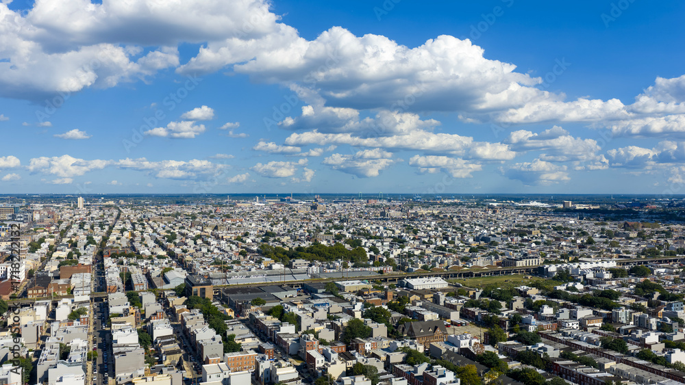 Aerial shot of skyscrapers, office buildings and hotels in the skyline in Philadelphia Pennsylvania USA