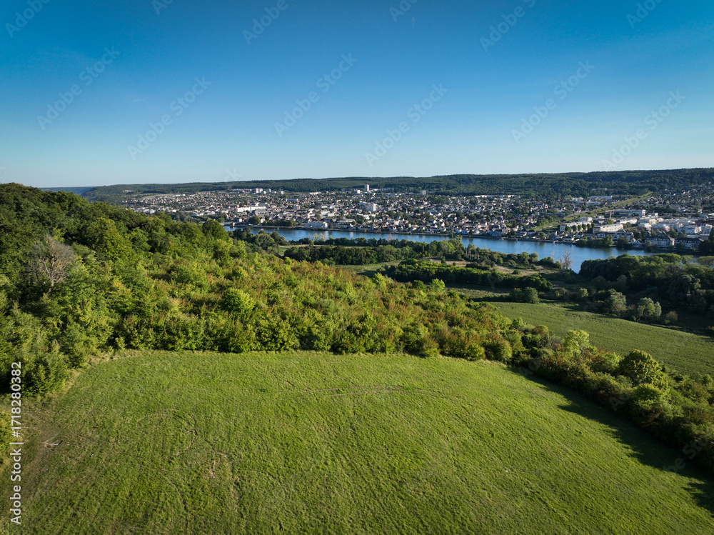 Vue aérienne de la vallée de la Seine en Normandie et sur la ville de Vernon près de Giverny, prise avec un drone.