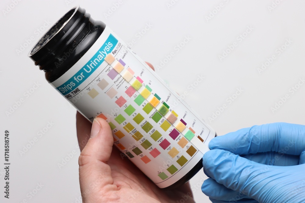 Urinalysis strips to test urine sample in a light background and copy space