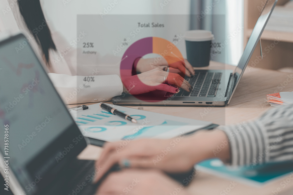 Two businesswomen having a meeting and looking at financial data, charts and graphs on a digital tablet. Business consultant analyzing financial figures.