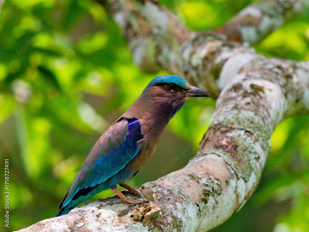 A Indochinese Roller or Indian Roller sat still on a tree limb at Kaeng Krachan National Park Thailand