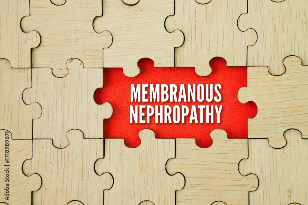 Wooden puzzle with the word membranous nephropathy. one of the many glomerular diseases causing nephrotic syndrome. It is characterized by proteinuria, presenting with peripheral edema and frothy urin