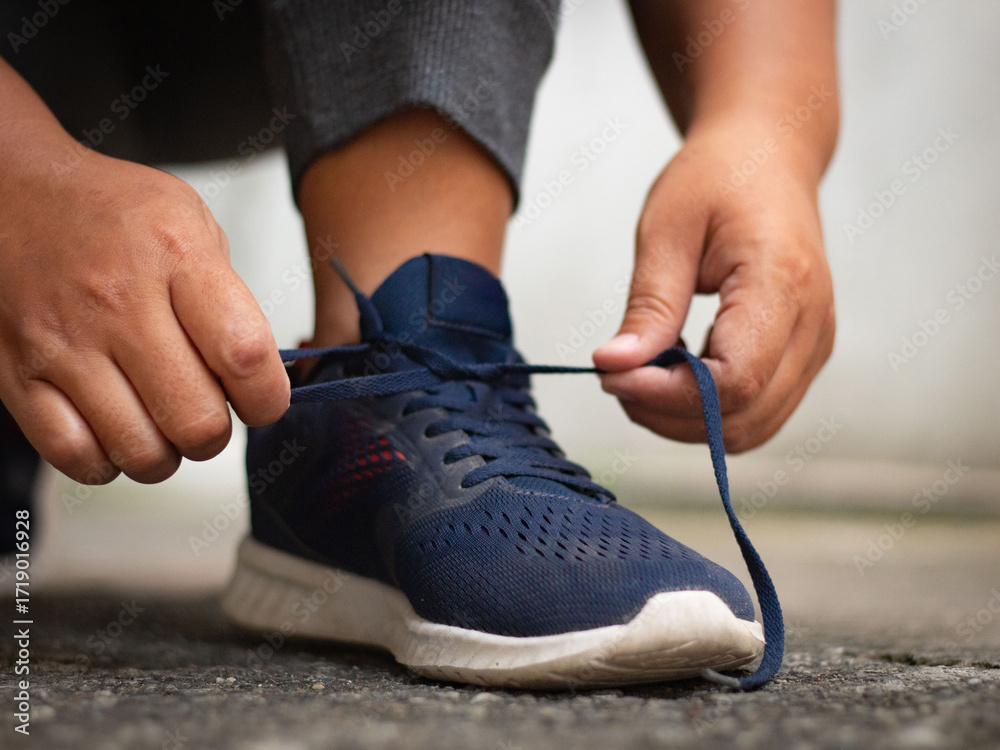 young asian women use their hands to tie their shoes jogging in morning workout at the city