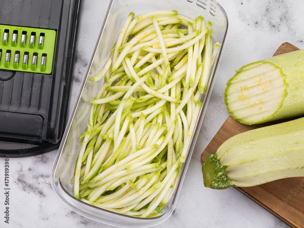 Vegetable marrows grated with a vegetable cutter in a transparent container, top view