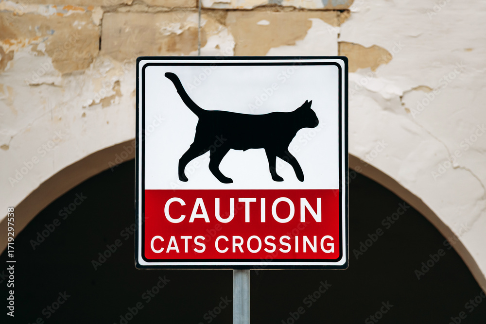 Funny street sign reading Caution Cats Crossing with a black cat silhouette mounted on a pole against an old stone wall background in the fishing village of Marsaxlokk