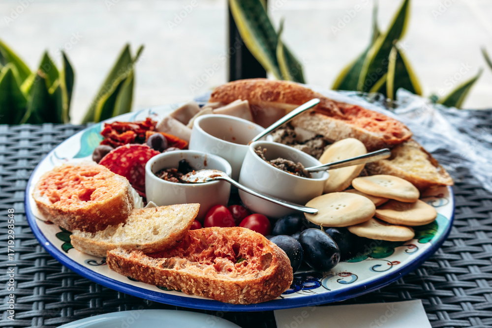 Folgende Fotos können Ihr Interesse wecken: antipasto, vorspeisen, authentisch, brot, bruschetta, close-up, aufschnitt
