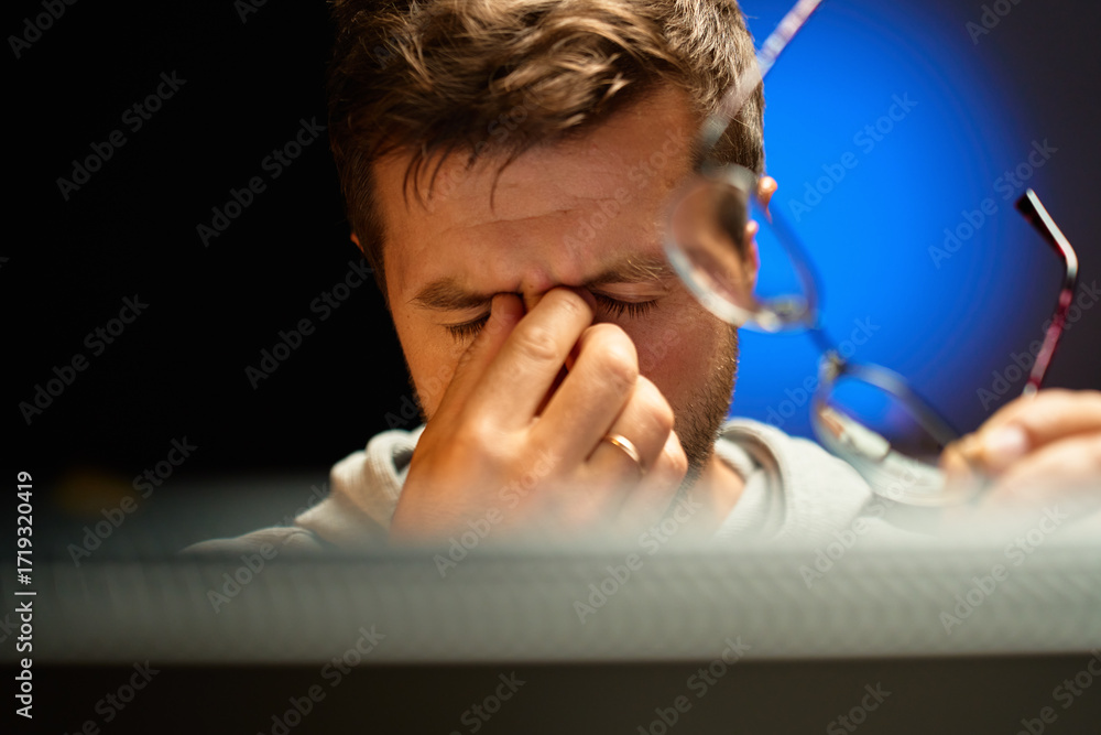 Close-up of tired man rubbing his eyes and holding glasses while sitting at computer. Person has fatigue and headache from overwork and eye strain