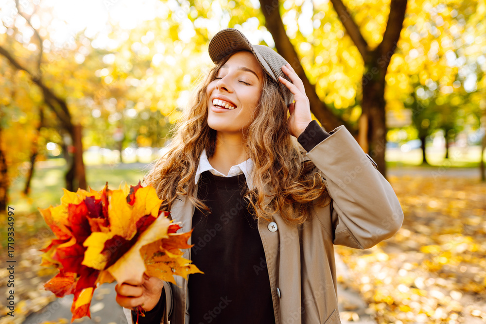 A young woman in a raincoat stands with a bouquet of fallen leaves in an autumn park. A beautiful tourist strolls and enjoys the sunny weather outdoors. Concepts of fashion, seasonality, and leisure.