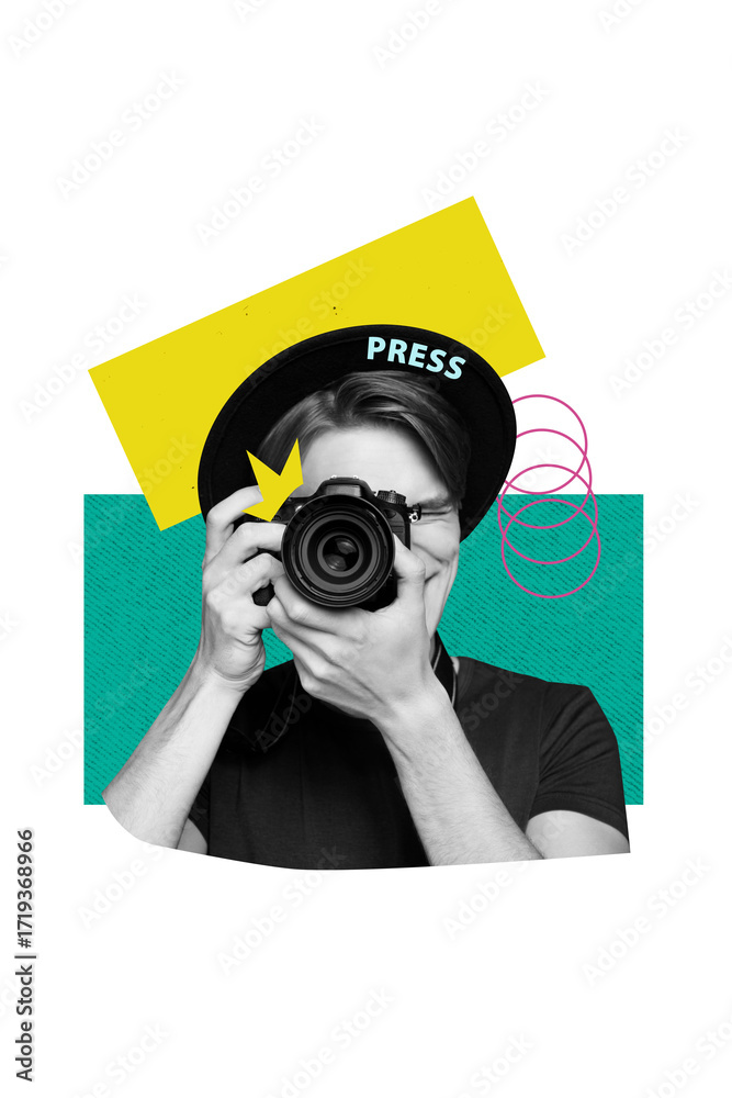 Vertical photo collage of happy guy reporter take picture press mass media broadcast photographer isolated on painted background