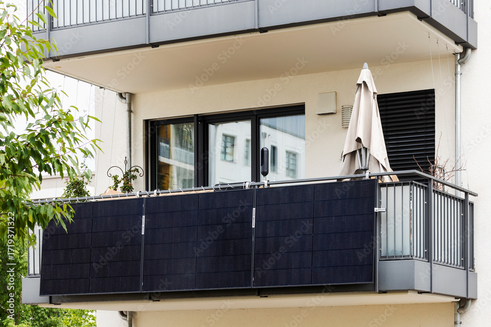 Balcony Solar Panel Energy System. Modern Balcony with Solar Station on Balcony Railing of Residential Apartment Building.