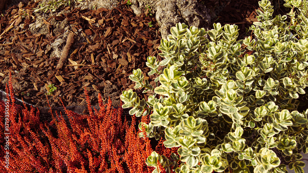 Euonymus fortunei bush with vibrant green leaves beside blooming red Erica, decorative mulch of brown wood chips, ornamental plants growing at tree base, natural garden design photography.