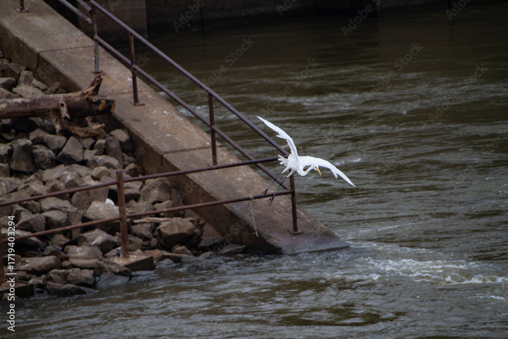 Great Egret in flight over the troubled waters by the hydroelectric dam and concrete barrier with railing