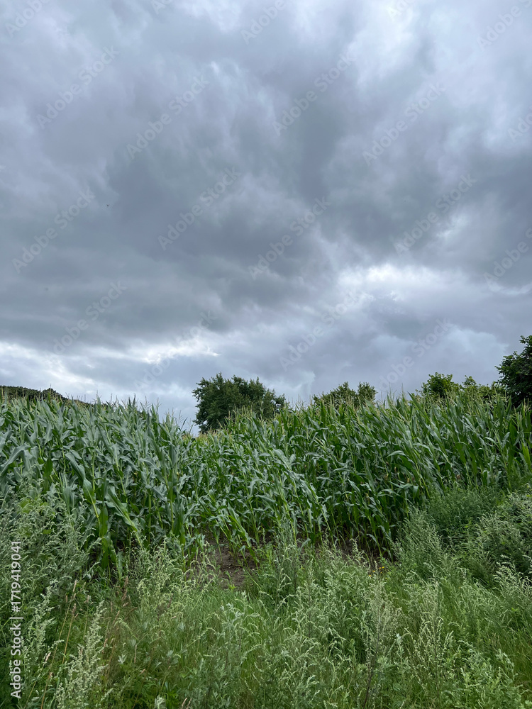 Sommergewitter - graue, dunkle Wolken über einem frischen und grünen Maisfeld in Schleswig-Holstein