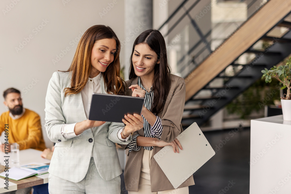 Two Professional Businesswomen Discussing Work on a Tablet in a Stylish Office