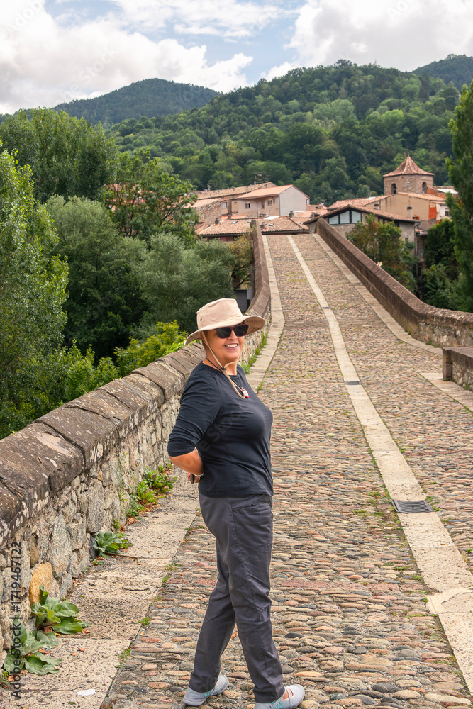 Mujer con sombrero en la , del puente viejo de estilo romanico de sant joan de les abadesses en Girona, Spain