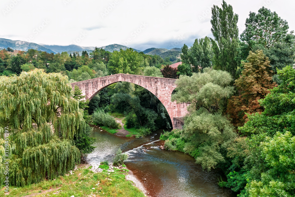 paisaje del puente viejo de estilo de, con un rio y verdes arboles en sus riberas, Girona, Spain