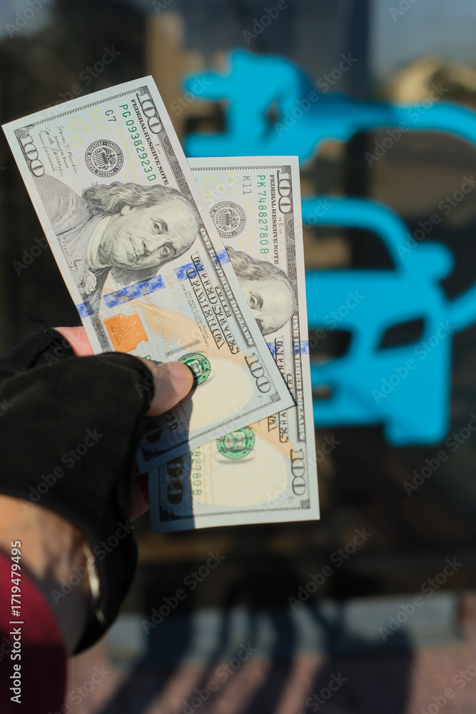 Blurred photo of a hand holding US dollar bills at a public electric vehicle charging station. Money, energy, electromobility, green future.