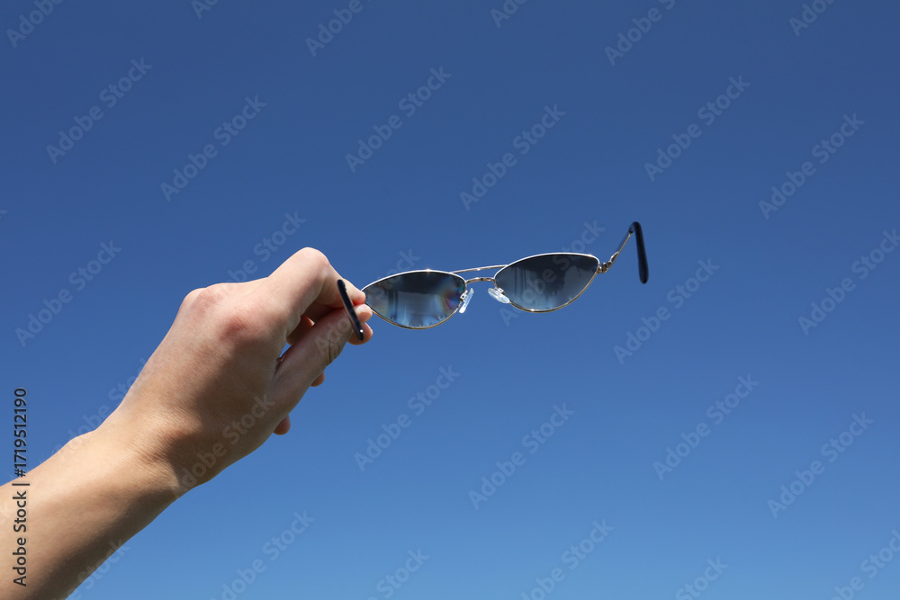 Woman holding stylish sunglasses against blue sky, closeup