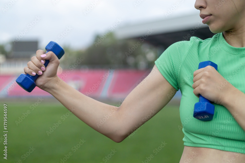 Woman is holding two blue dumbbells and appears to be performing an arm exercise