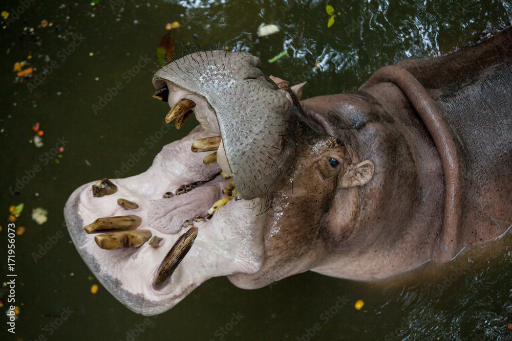 Portrait of Hippo with open mouth and dirty teeth. the view from the top