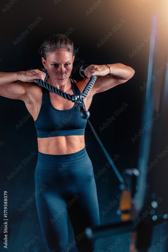 Training on a back cable machine in the gym, a woman enhances shoulder strength and coordination. This versatile exercise promotes long-term health and boosts confidence with targeted resistance.