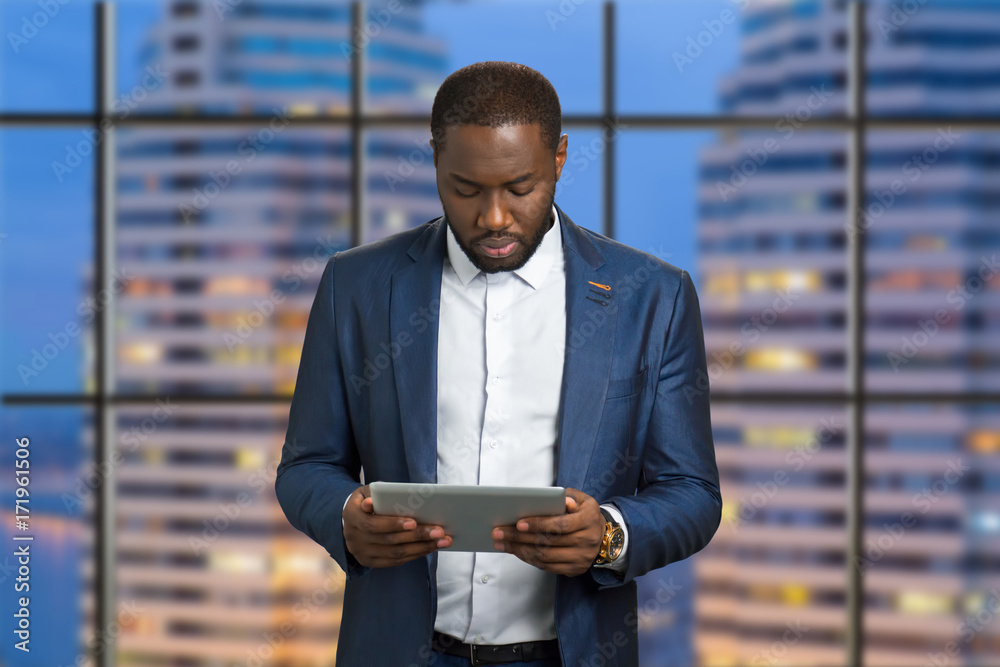 Handsome businessman holding computer tablet. Confident dark skinned manager looking down at digital tablet. Afro american executive with pc tablet on evening skyscraper background.
