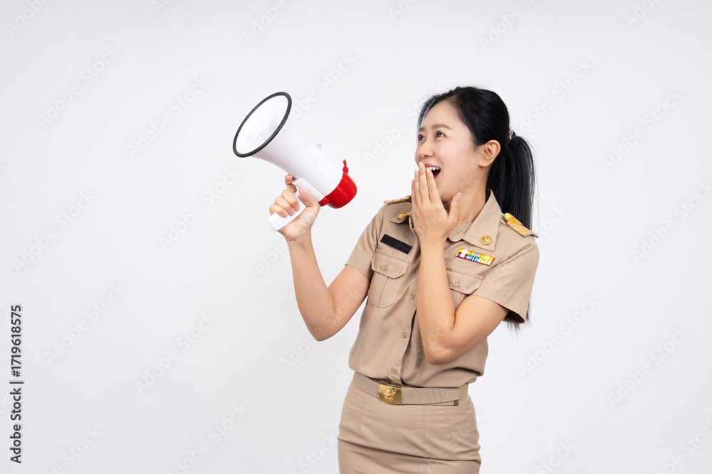 Asian woman in brown Thai government uniform holding a megaphone isolated on white background. Speech and announcement concept.