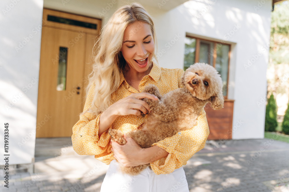 Happy smiling woman holding adorable pet poodle in front of modern house, pet love concept