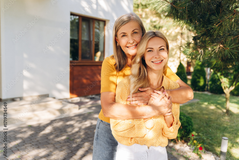 Happy mother and daughter embracing in front of house looking at camera together