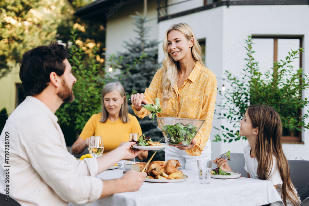 Family enjoying dinner together in the backyard of their house