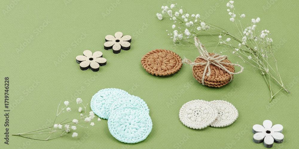 Crochet face scrubby cotton pads. Handmade reusable accessories for eco beauty routine