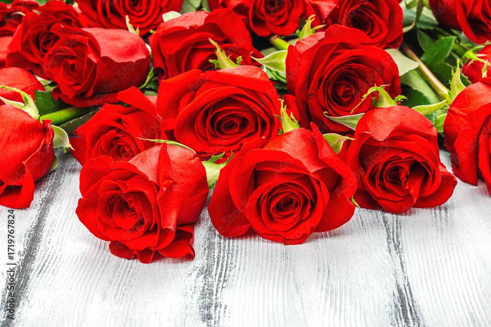 A bouquet of red roses on a white background. Blooming flowers, festive concept for Mother's Day