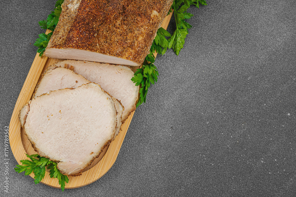 High-protein roasted pork loin served with tasty sauces, styled for food photography