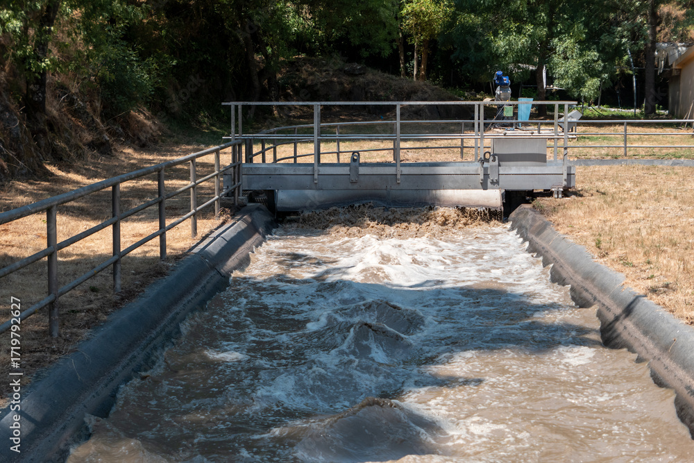 Unidade de tratamento de águas residuais com a grade de peneiramento em ação e efluente em processamento
