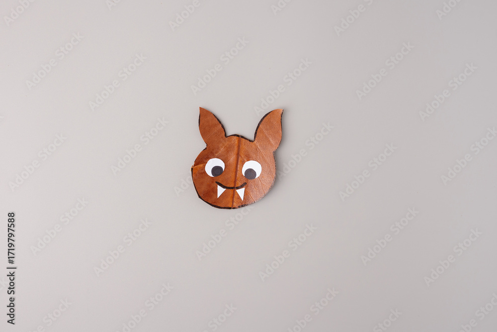 DIY bat face craft from dried leaves halloween project autumn decoration creative activity for kids flat lay composition useful for schools art teachers holiday workshops and eco education business,