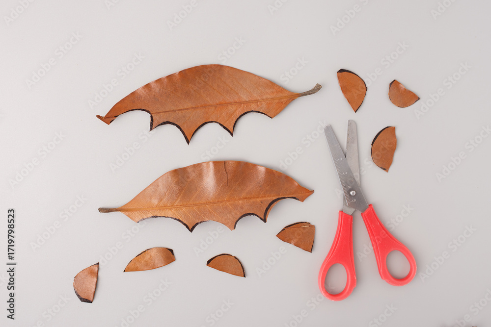 Hand-cut bat wings from leaves for Halloween craft, great for DIY blogs, children workshops, eco-conscious brands, handmade product listings, seasonal content creators