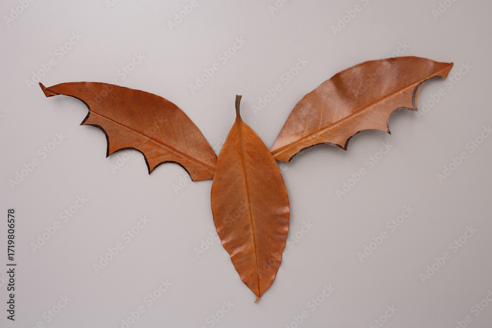 Halloween diy bat craft using dried brown leaves step by step tutorial autumn decoration activity for children flat lay composition ideal for craft stores education services seasonal business,