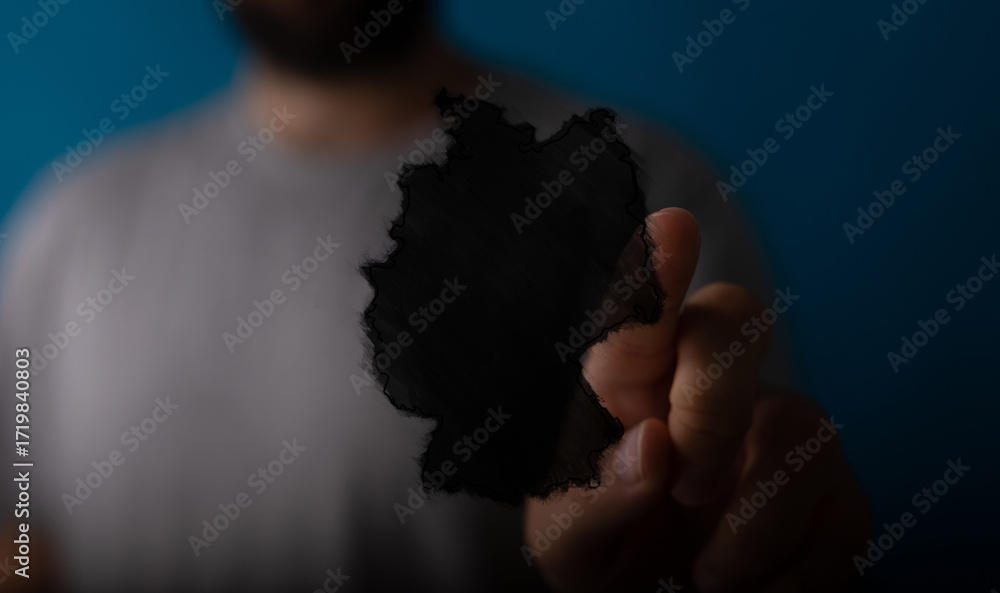 Abstract image of a man holding a black shape resembling a map. Perfect for concepts of loss, mystery, or Germany.