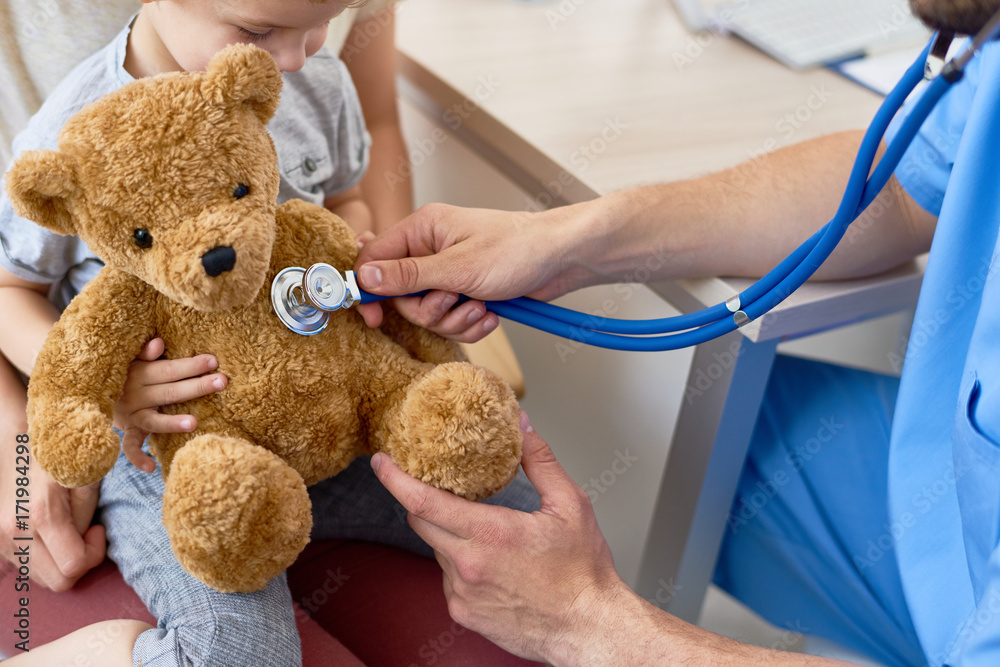 Unrecognizable pediatrician examining plush teddy bear with help of stethoscope while his little patient having check-up