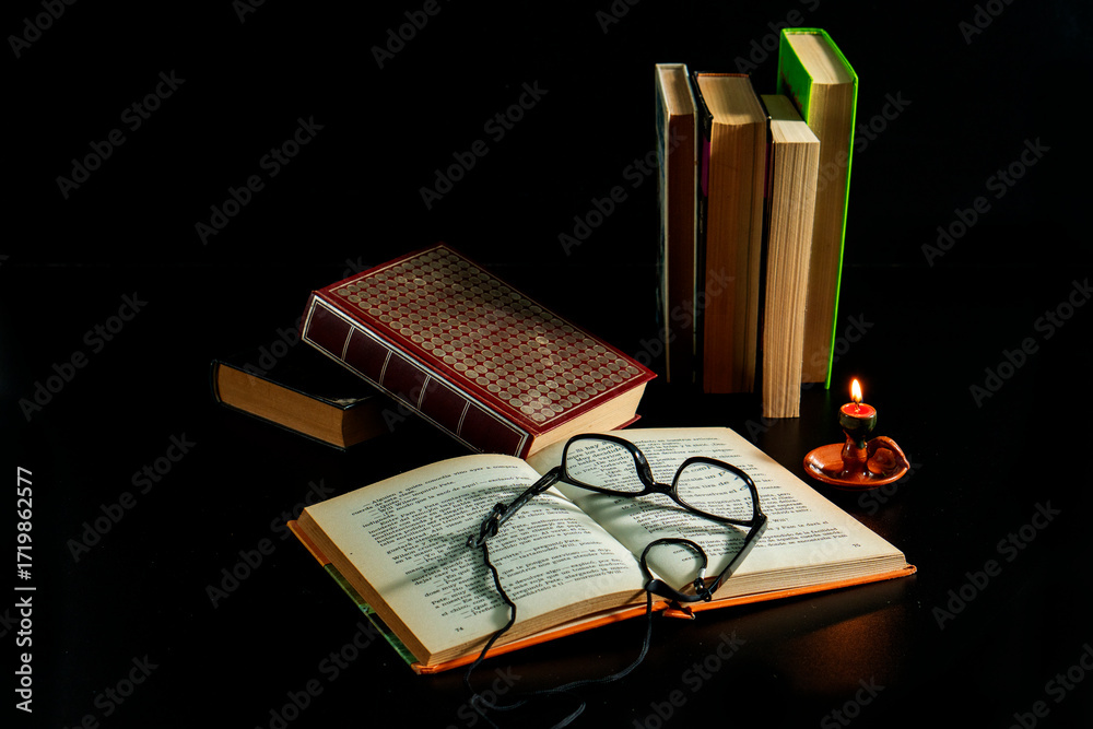 A book is open on a table with a candle and a pair of glasses