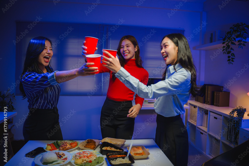 Three happy young Asian businesswomen celebrating with a toast and red cups, enjoying food at an office party