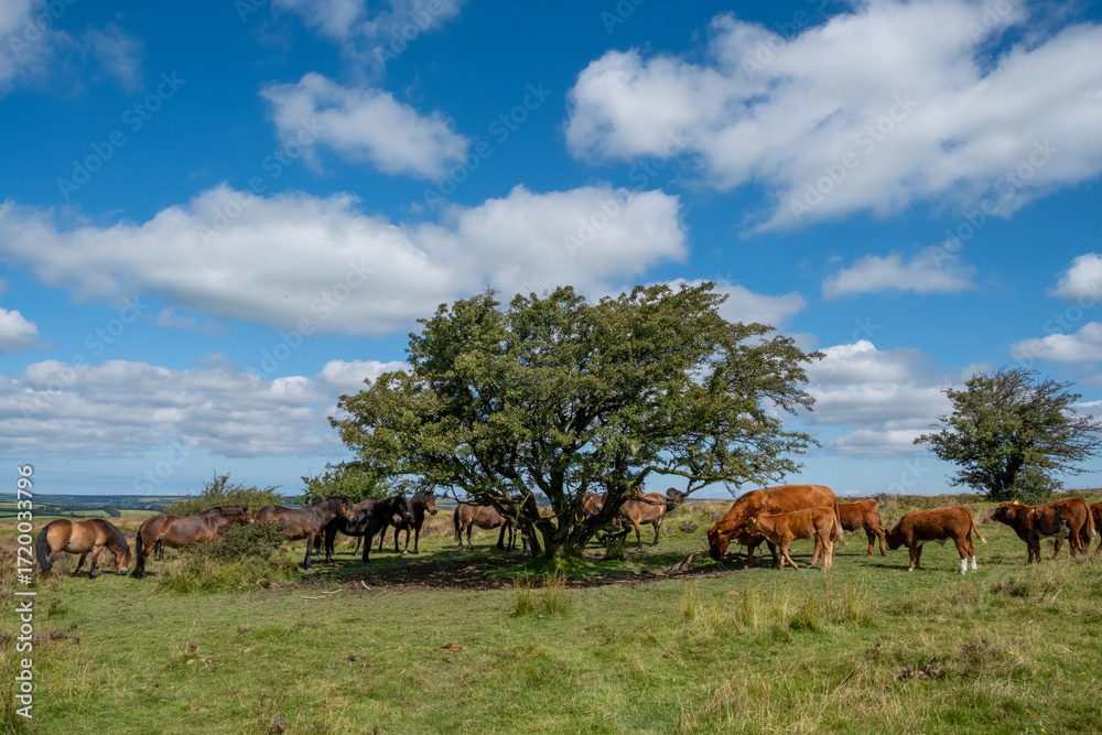 Eine Herde Wildpferde und Rinder stehen sich gegenüber, getrennt durch einen Baum und unter blauem Himmel mit Wolken.