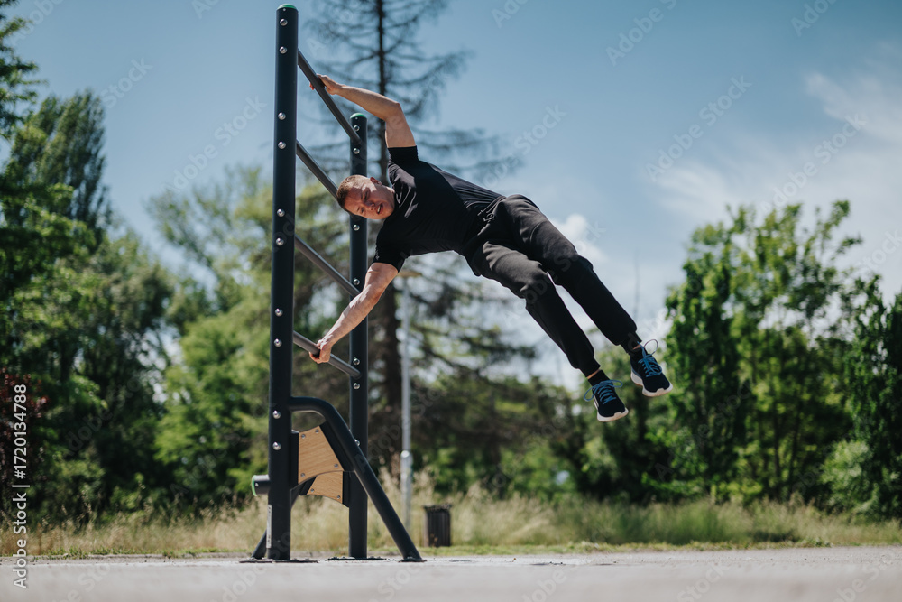 A man demonstrates advanced calisthenic skills on outdoor fitness equipment in a green park setting, showcasing strength and balance.