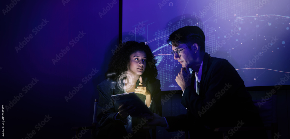Business team discussing and using technology artificial intelligence with digital Ai assistant. Futuristic innovation AI technology collaboration and ideas for future. Business Tech Startup meeting.