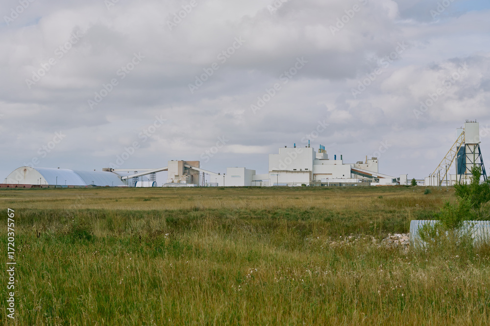 Main processing building of a potash plant in Saskatchewan, Canada, with white industrial architecture, ventilation stacks, and smoke rising under dramatic dark clouds.
